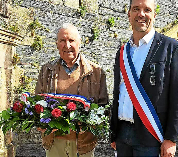 « Jeune » honoré par le maire lors des vœux, Jean Porhel, 88 ans et presque doyen de la commune, assume toujours son rôle lors des cérémonies commémoratives à La Roche-Maurice. Très concerné par le devoir de mémoire, il en est lui-même le représentant dans la commune. Photo : Jean Porhel et Lénaïc Blandin honorent le devoir de mémoire