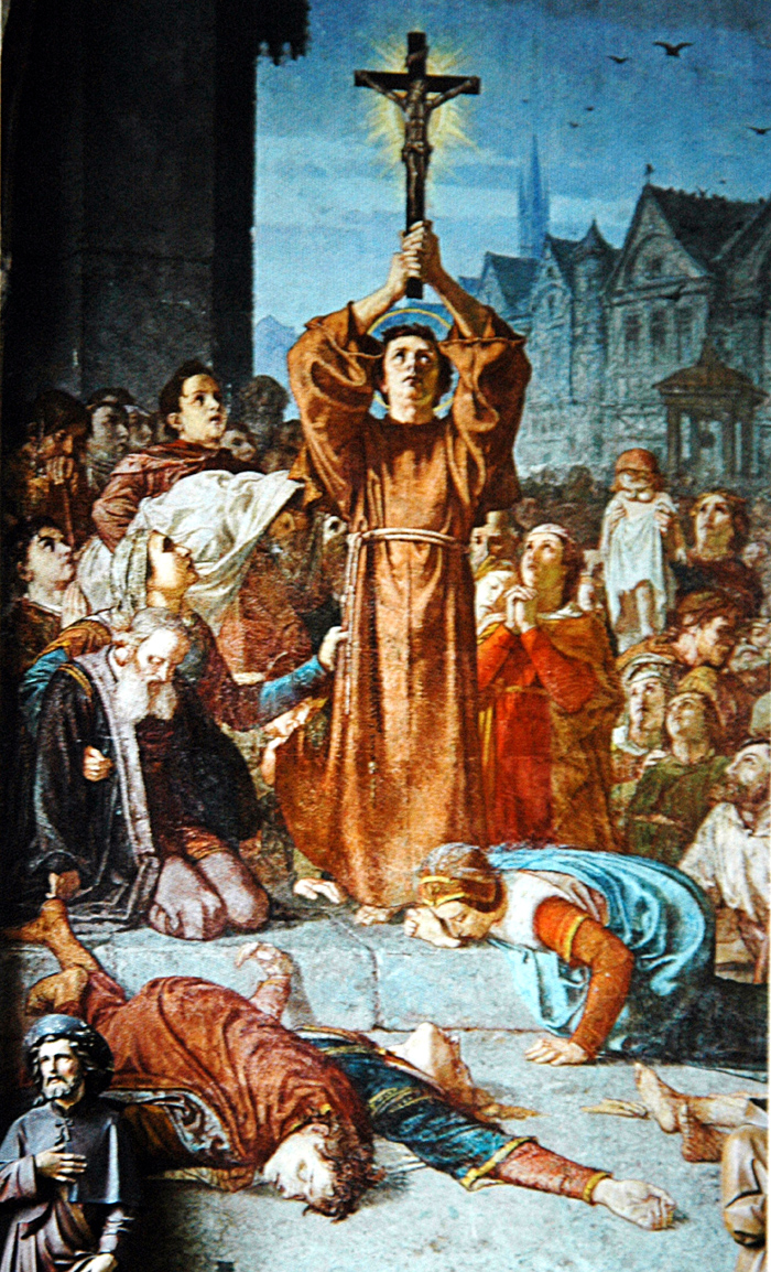 Saint Frédéric martyrisé Saint Frédéric est assassiné après avoir célébré la messe dans sa cathédrale, sur l'ordre de l'impératrice Judith. On pourra s'émouvoir devant la mort si pathétique de ce saint, assassiné sur les marches de l'autel et priant, au moment d'expirer, pour ses deux bourreaux, dont l'un guette dans le fond du tableau, tandis que l'autre s'enfuit au dernier plan. |