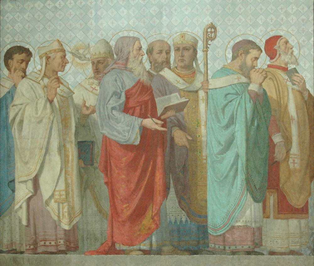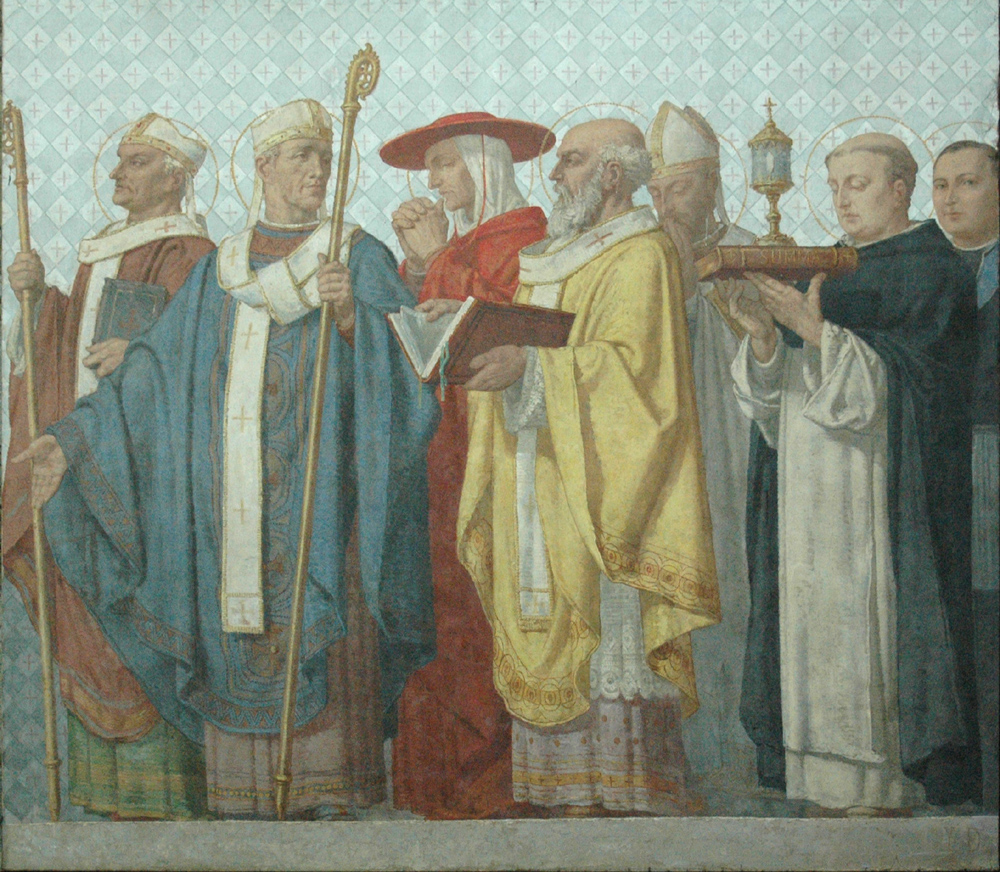 Dans cette procession, Yan' Dargent a peint saint Bonaventure sous les traits de Jacques-Théodore Lamarche, évêque de Quimper et Léon de 1888 à 1892. Il était né à Paris le 15/3/1827 et mourut à Quimper le 15/6/1892.