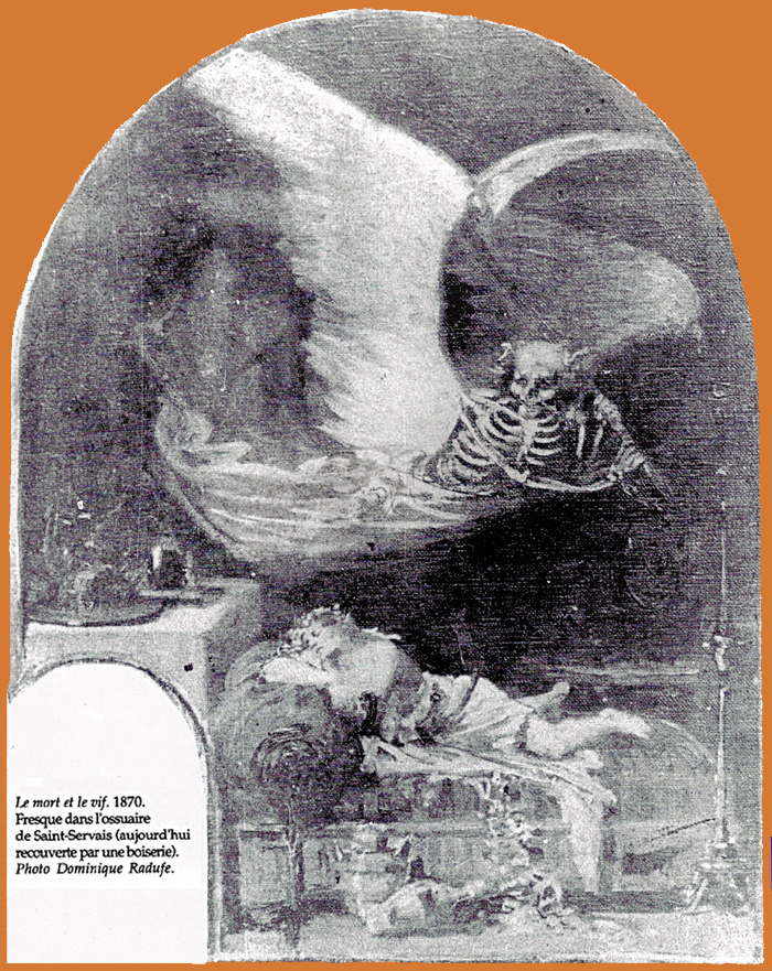 La mort et le vif : Rongée par l'humidité, cette fresque a été recouverte en 1895 par une boiserie portant une toile de Yan' Dargent La Sainte Famille. Elle nous est connue par une photographie. Une gravure sur bois parue dans La Semaine Illustrée du 23 février 1873 reprend le même motif, le mercredi des Cendres.