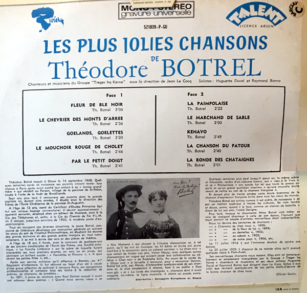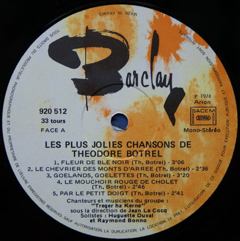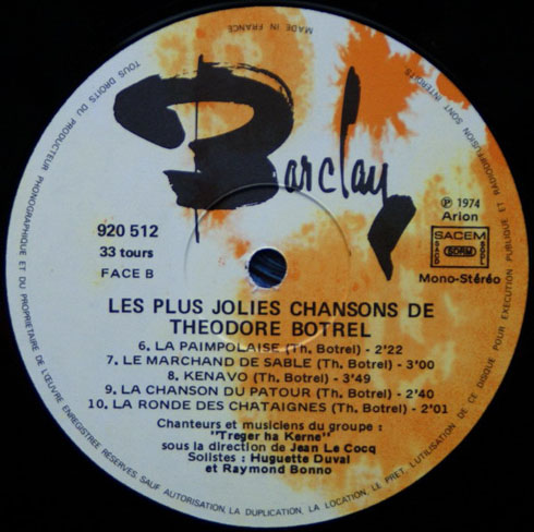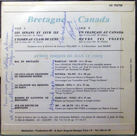 Sur la même cire, Jean Le Cocq, au biniou, et Gérard Bonno, à la bombarde, ont enregistré "Kousk Breiz Izel", "La chanson des Bretons de Paris" et la chanson des cercles celtiques (hors de Bretagne). Toutes les paroles sont en français.