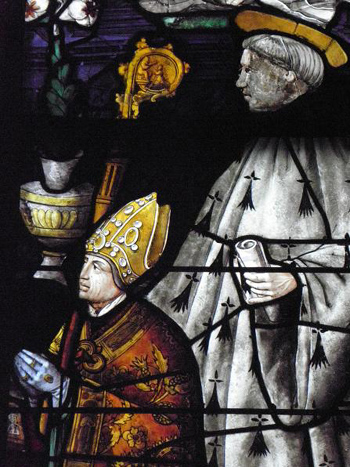 Vue partielle du vitrail de l'annonciation (1536) - Eglise collégiale de La Guerche de Bretagne - Yves Mahyeuc très dévot vint y prier. Il est représenté à genoux aux pieds de la Vierge (qu'on ne voit pas ici), derrière lui saint Yves, son patron, revêtu d'un surcot d'hermines.