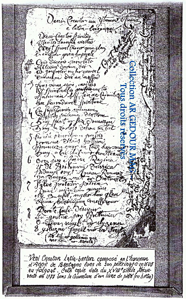 Le directeur de « Feiz ha Breiz », expliqua Herry Caouissin, n’avait pas eu connaissance de cet hymne latin-breton du 16ème siècle, chanté sur la mélodie grégorienne du 9ème siècle, car il l’eût sûrement publié et avec quelle joie dans sa revue. « C’est en l’examinant que j’ai discerné des lignes manuscrites au verso de cette page noircie par le temps et l’usage. Avec un soin minutieux, ma femme réussit à le décoller sans le détériorer. Aussi quelle fut notre surprise d’y découvrir un Veni Creator latin-breton, composé par surcroît, en l’honneur d’Anne de Bretagne et de son vivant comme l’indiquait cette note : « Cempenet gant Ivo Caervoyec, enn henor an Ytroun Anna, hon ducgez-roanez, o pardony er Foll-Coet » (Arrangé par Yves Caevoyec, en l’honneur de Madame Anne, notre Duchesse-reine, en pélerinage au Folgoat).
