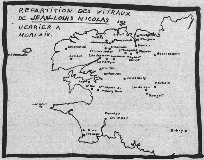 1842, fin du Tour de France, 26 ans, Jean-Louis Nicolas ouvre boutique à Morlaix, rue des Bourettes, épouse Mademoiselle Bolloré, fille du peintre de Landivisiau où il fit son apprentissage. Premiers travaux, on lui confie des décorations d'églises et de châteaux. Il cherche à se lancer dans le vitrail. Se monte un four et achète des débris de plomb, écrit à son filleul, ouvrier, par hasard, à la manufacture de vitraux de Tours, lui expliquant qu'il voudrait faire des vitraux. La réponse est : "une affaire qui demande beaucoup de science, d'argent et d'ouvriers", "Si la manufacture de Tours réussit, c'est parce qu'elle est d'une part aux mains du clergé."