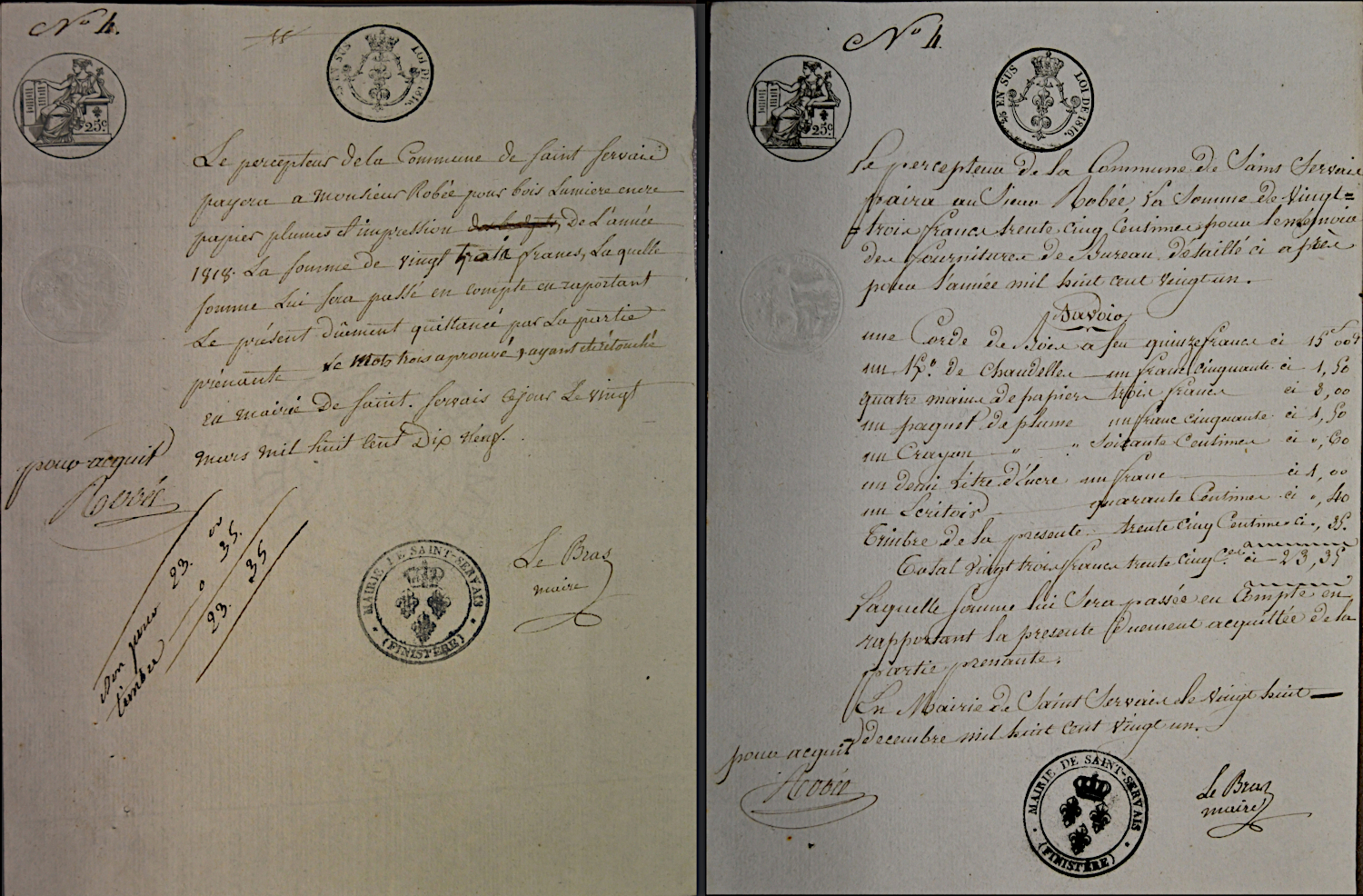 Ce jour 20 octobre 1817 je soussigné Pierre Guillaume Le Pivain, greffier de la justice de paix du canton de Landivisiau, arrondissement de Morlaix, département du Finistère, certifie et rapporte qu'à la requête de Monsieur Pierre Robé, débitant de tabac au bourg de Saint-Servais et y demeurant, fermier sortant du château de Brezal en la commune de Plouneventer, me suis, ayant préalablement fait la déclaration conformément à la loi au Bureau de l'Enregistrement de landivisiau et fait faire par ailleurs les publications d'usage, transporté jusques et audit château de Brezale à l'effet de procéder à la vente publique et volontaire de quelques meubles et effets mobiliers dont il est dans l'intention de se défaire argent comptant.