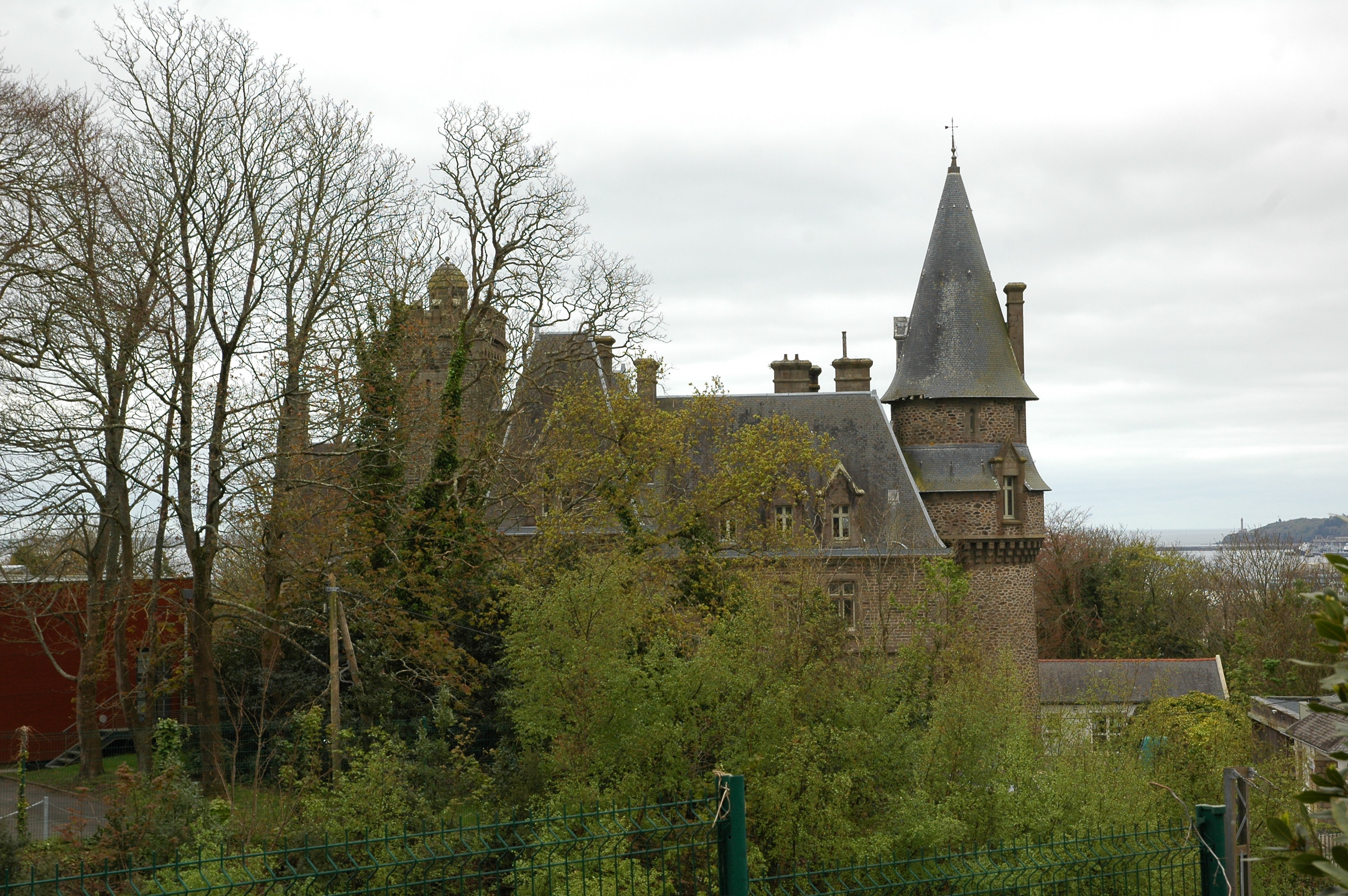Le château de Kerantraoñ, construit vers 1864. Les trois chiens-assis proviennent du château de Coatlosquet à Plouneour-Menez et ont été ajoutés au 20è siècle