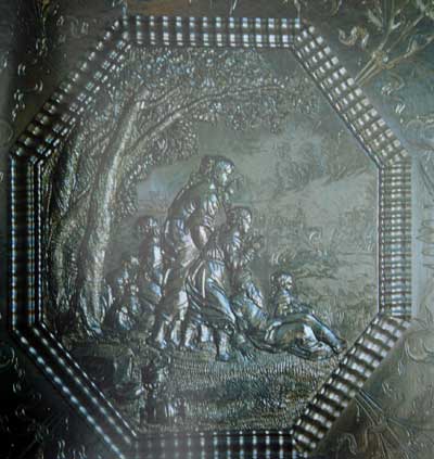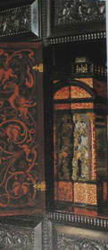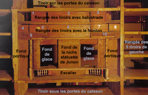 ![]() | A droite, détail du vantail intérieur illustrant une scène de l'Ariane dans un encadrement octogonale ondé. Plus bas, le caisson de ce cabinet est presque entièrement plaqué de plaques d'ivoire ou d'os peintes façon écaille, avec une statuette en bois sculpté représentant Junon. L'escalier central dissimule des tiroirs comme sur celui de Mercure. Lors de la restauration de ce cabinet (voir Estampille Objet d'Art n° 29 juin 1992) les miroirs ont été refaits par Patrick Desserme, maître verrier, ainsi que deux colonnes manquantes en ivoire teintes façon écaille. |