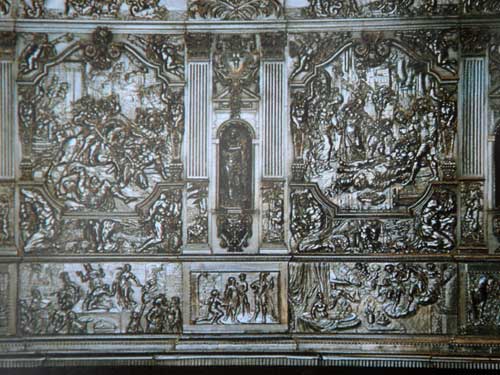 A droite, la gravure originale ayant servie de modèle au sculpteur. Quinze gravures d'Abraham Bosse, illustrant ce célèbre roman serviront au décor de ce cabinet, aussi bien à l'extérieur qu'à l'intérieur. |