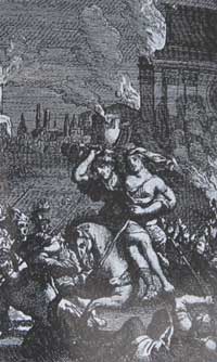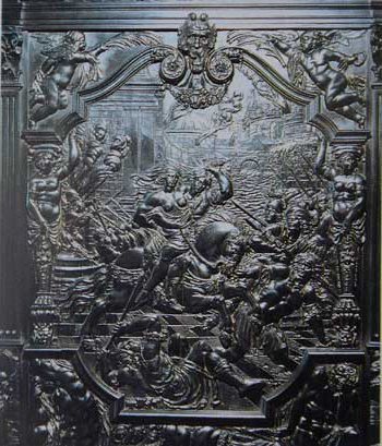 Détail du panneau du vantail de gauche représentant l'une des scènes principales du roman de l'Ariane de Jean Desmarets de Saint-Sorlin : "Mélinte tient Ariane sur son cheval et s'enfuit à travers les flammes, suivis par Aristide, Palamède et Epicaris".