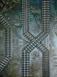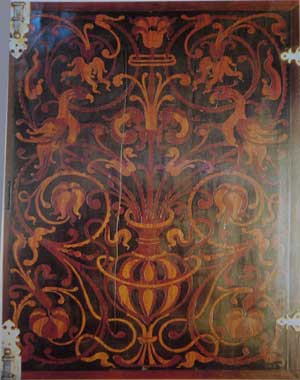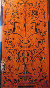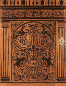 ![]() Ci dessus, détail du portique de ce cabinet, marqueté d'un vase et plaqué des mêmes plaques d'ivoire peintes façon écaille. | ![]() |