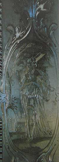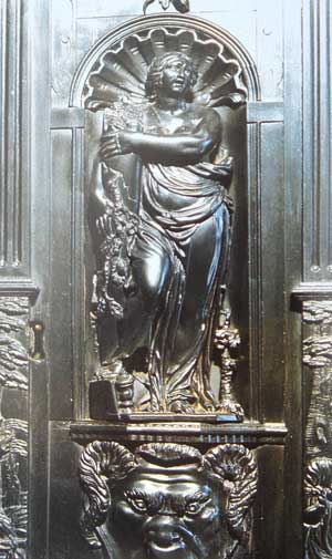 | Au-dessus. A gauche, détail l'intérieur des vantaux des moulures ondée et des fleurs gravées. Au milieu, une femme gravée toujours sur l'intérieur des portes. Et à droite l'une des trois niches de la façade extérieure représentant la "Force". Les moulures ondées sont préfabriquées à la machine à l'époque, décrite dans le Roubo, puis collées pour constituer le décor. Elles étaient vendues au menuisier en ébène au mètre et ce dernier devait les couper et les ajuster selon l'effet recherché. | ||