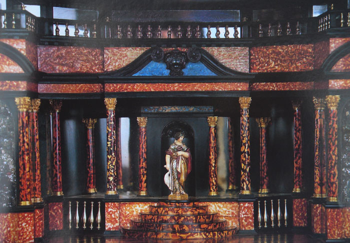 Il a été minutieusement restauré en 1992 par Jean-Baptiste Chapuis, ébéniste. Il est intéressant de remarquer qu'il avait été déjà restauré au XVIIIème siècle. Le poids important du cabinet lui-même entrainait obligatoirement une restauration du piètement. Il a été modernisé dans la première partie du XVIIIème remplaçant les pilastres, sans doute les colonnes ou des termes par ce piètement galbé. Déjà à cette époque, chose rare, on prenait soin de ce meuble déjà démodé, il y avait donc une tradition importante quant à sa provenance et à la connaissance de sa valeur artistique. |