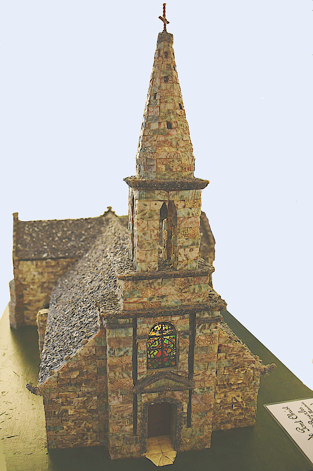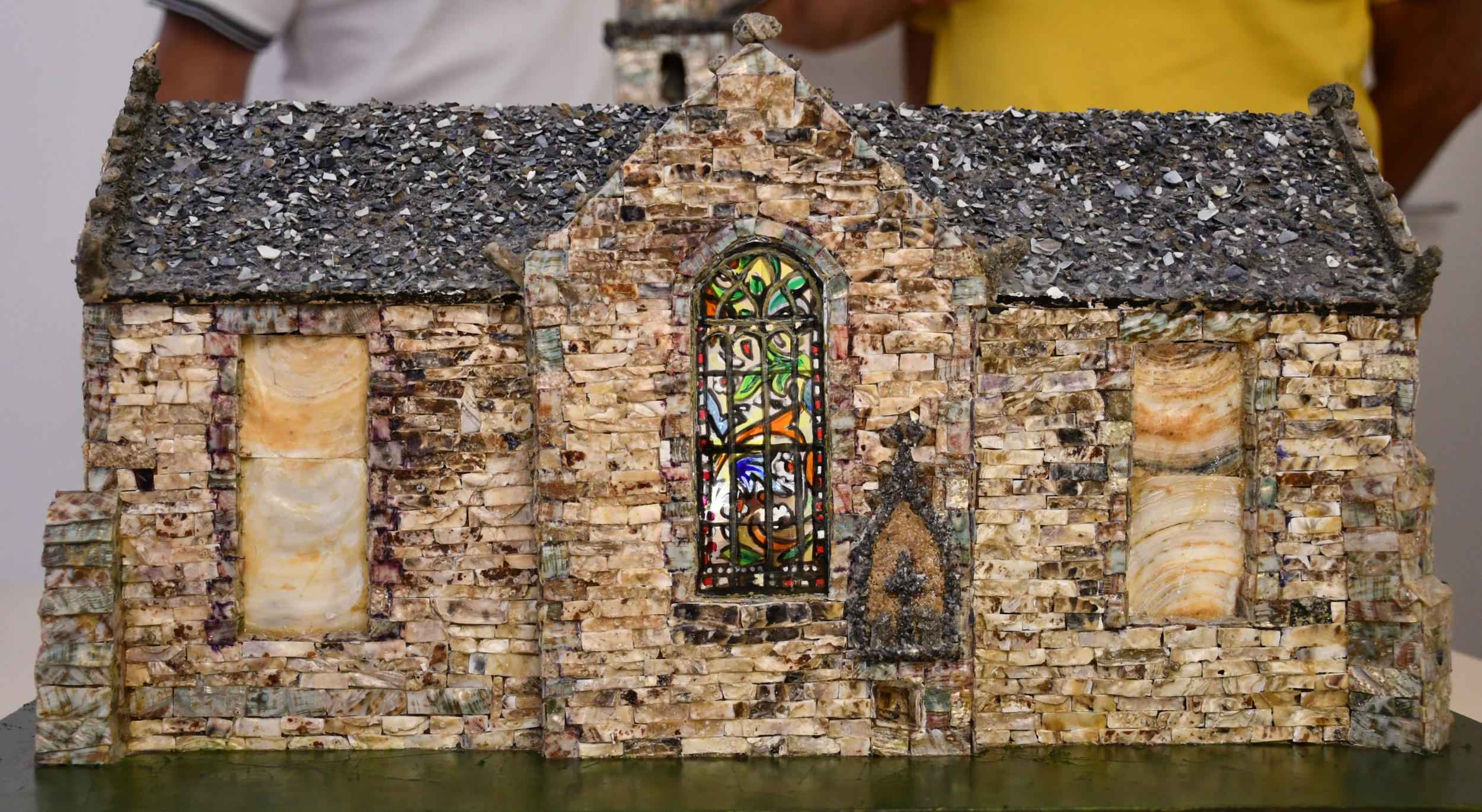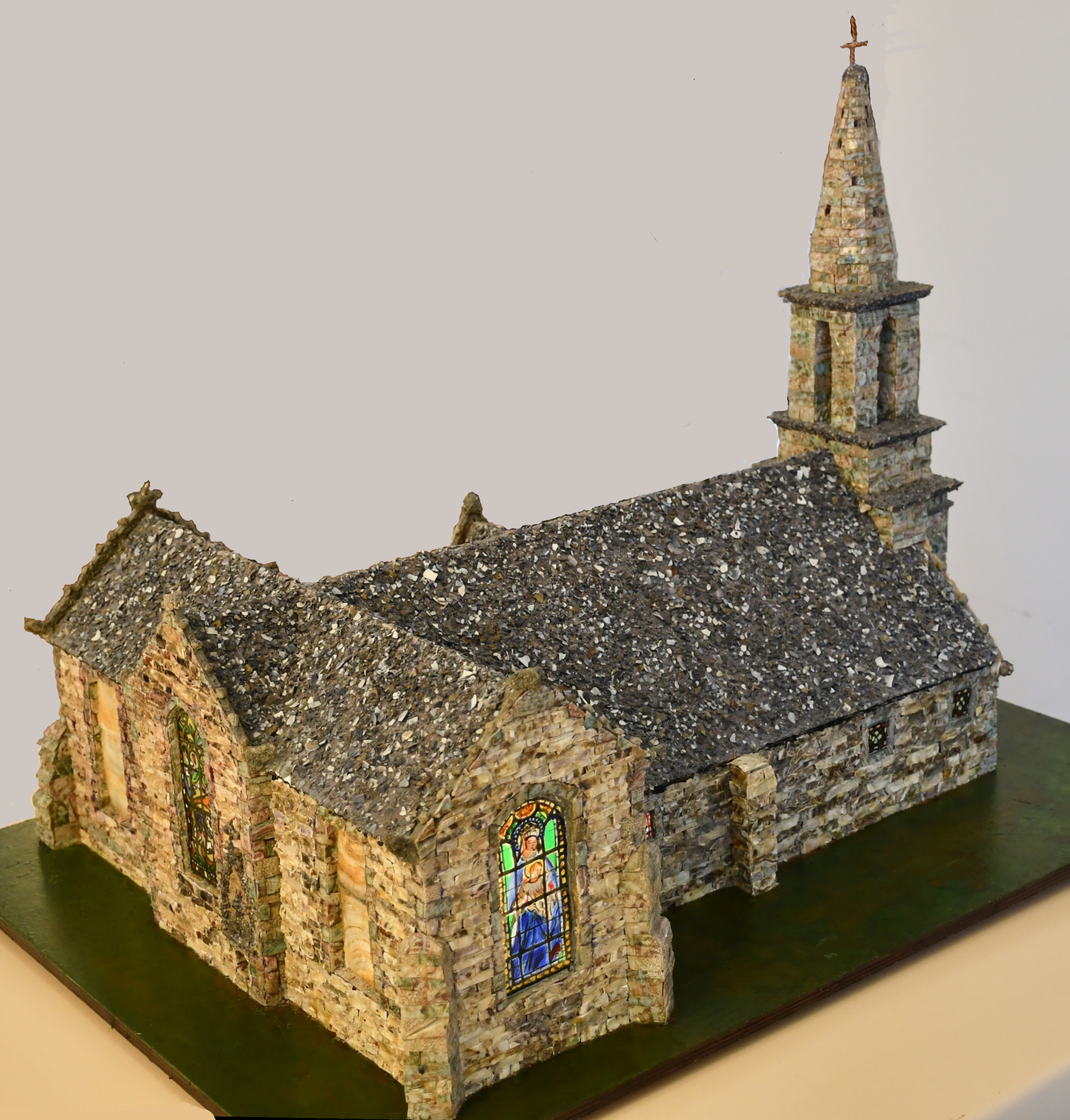 Maquette en coquillage : moules (toît), huîtres et ormeaux (murs), coquillage de corse (cloche), sexe du crabe mâle (marches du clocher).