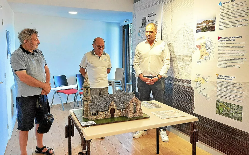 De gauche à droite : André Croguennec, historien, Jean-Claude Bourlès, créateur de la maquette, et Lénaïc Blandin, maire de La Roche-Maurice,