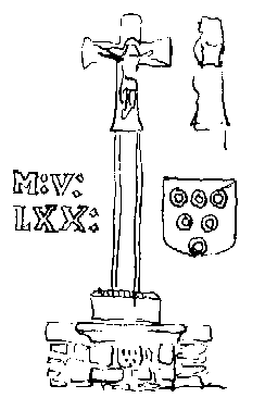| Calvaire : 2881. Saint-Urbain S-E, Croas-Madec, kersanton. 4m. XVè s., 1570. Soubassement, table reposoir, écu Brézal-Coatelan. Socle cubique, pans: LAN M: V: LXX: SEL PEVLET: HANNA: SALVDET:. Fût à pans. Croix, base tronconique, fleurons carrés, crucifix (XVè s.) (source http://www.croix-finistere.com) Bien que l'auteur des lignes précédentes ait vu sur le calvaire l'écu de Brezal, j'ai des doutes. L'écu est aujourd'hui très érodé, mais la représentation ci-contre est exacte. Il s'agit donc de 6 annelets et non de 6 besants. Dans ce cas, ce serait l'écu de Buzic : "de gueules à six annelets d'argent, 3. 2. 1.", Buzic seigneur en autres lieux de Kerdaoulas, paroisse de Dirinon. |