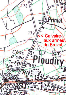 Et estant sortis de la maison du reliquaire sur le cimitière d'attache à icelle, ledit sieur de G/saint nous avoit demandé pour assurer premièrement qu'il n'y a qu'un seul escusson en bosse aux armes dudit seigneur de Brezal en escartelé dans le massonage en pierres de grain au-dessus de la porte dudit reliquaire ni en bosse ni en peinture, ledit reliquaire estant proche de la tour de l'église dudit Ploudiry, secondement nous estant rendus vis à vis de ladite tour et principalle entrée d'icelle, qu'il y a au-dessus de la porte un autre escusson en bosse aux pleines armes dudit seigneur de Brezal, comme elles sont cy-devant spécifiées, et au-dessus de cet escusson en supériorité un grand trou dans le massonnage d'environ deux pieds et demy de longueur et deux pieds de largeur, que ledit sieur de G/saint nous a déclaré avoir esté fait et préparé pour recevoir l'escusson en bosse de Monsieur Le Duc de Rohan, seigneur supérieur de ladite église, suivant l'ordre donné aux architectes qui avoient le marché de la construction de ladite tour, troisièmement nous estant en compaignie rendus vis à vis du pignon de la lanterne de ladite église en dehors, qu'il y a au haut dudit pignon deux escusson en bosse, l'un en suitte de l'autre sçavoir en supériorité un escusson aux armes de mondit sieur Le Duc de Rohan qui nous ont paru estre neuff macles posées par trois, et au-dessous un autre escusson aux pleines armes dudit seigneur de Brezal que sont six bezants, trois, deux et un.