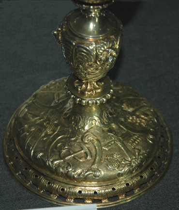 Le pied du ciboire avec le blason de Brezal Le métal n'a sans doute pas permis de mettre en évidence les couleurs de l'écu "de gueules à six besants d'or 3-2-1" ni probablement le dessin des besants qui ressemblent plus ici à des "annelets", mais le fait qu'il ait été retrouvé à La Roche et cité dans l'inventaire de 1706 ne laisse aucun doute sur son origine. | |