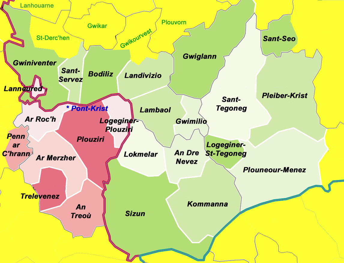 Kumunioù Bro-Chelgenn, sellit ouzh ar gartenn amañ (e liv gwer, kumunioù ar rann velestradurel Montroulez ; e ruz-sklaer, kumunioù an hini Vrest)