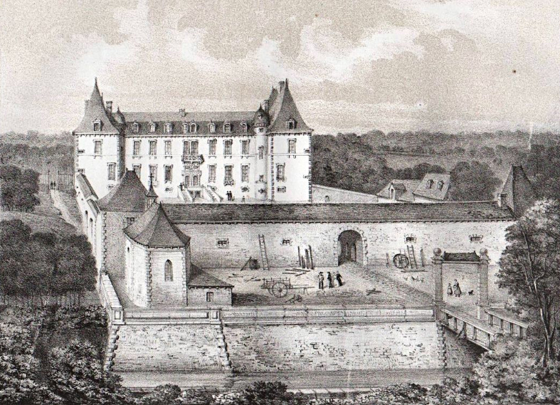 Le château de la Magnane à Andouillé, canton d'Aubigné, Ille et Vilaine, d'après une lithographie de 1845. Il fut reconstruit, en tout ou en partie, par René-François de Montbourcher, en 1784. À la suite d'un incendie en 1893, il fut rebâti.Herve du MESCAM (1426)