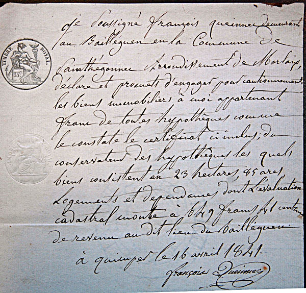 Agréez, etc. Le Maire de Landerneau, F. DUVAL.(L'Armoricain du 5/8/1843)