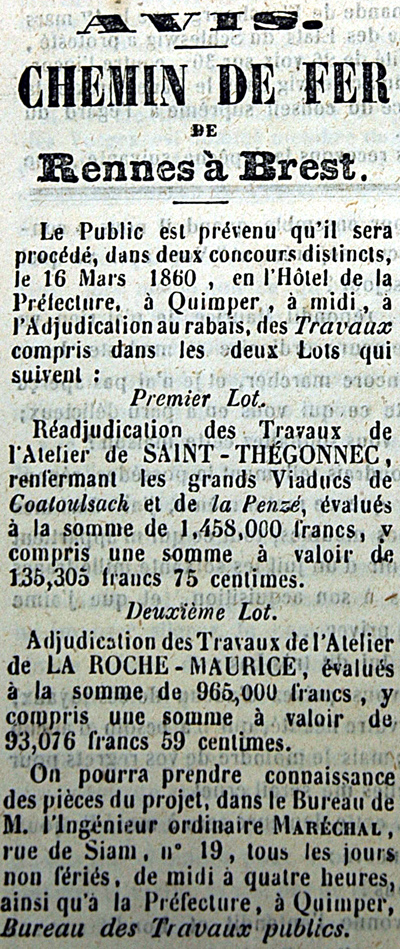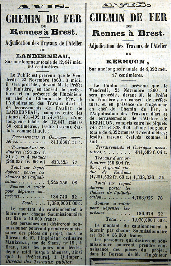 | Atelier de Kerhuon | Adjugé le 23/11/1860 en faveur des Srs Escarraguel, Maublanc et Le Souple, moyennant un rabais de 7 % Cet atelier comprend le grand viaduc de Kerhuon |