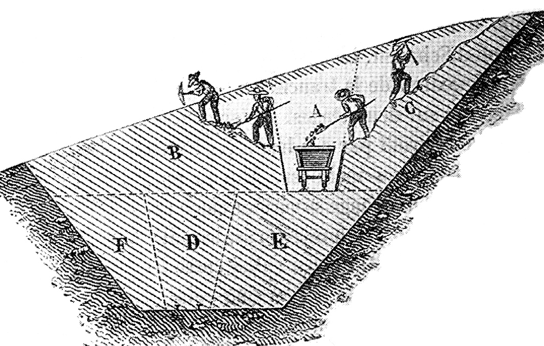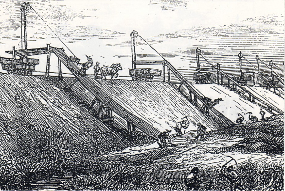 Travaux de terrassement : creusement d'une tranchée. Ici, les brouettes sont tirées sur des plans inclinés pour évacuer les déblais.