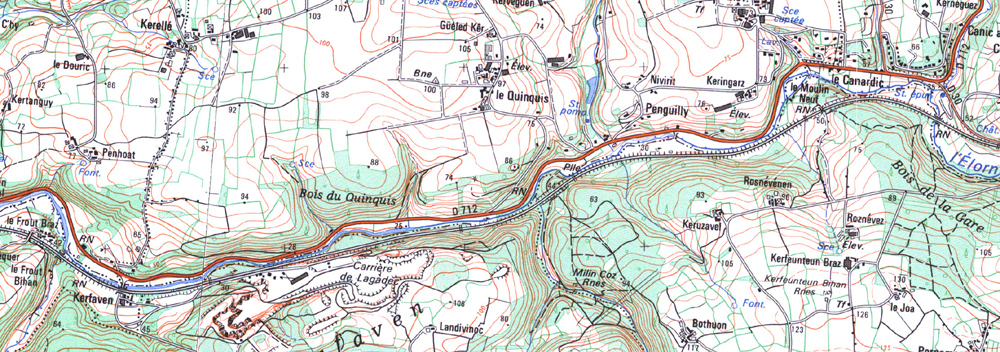 Le long de l'Elorn, aux environs de Kerfaven, un gros problème doit être surmonté. La voie doit passer entre le lit de la rivière et une colline de roche dure, un tunnel (ou des ponts ?) serait judicieux mais coûteux. On décide donc de dévier le lit de l'Elorn. La rivière, dont le cours est très sinueux, a été déviée sur neuf points différents. Nous avons réussi à localiser les 9, voir plus bas.