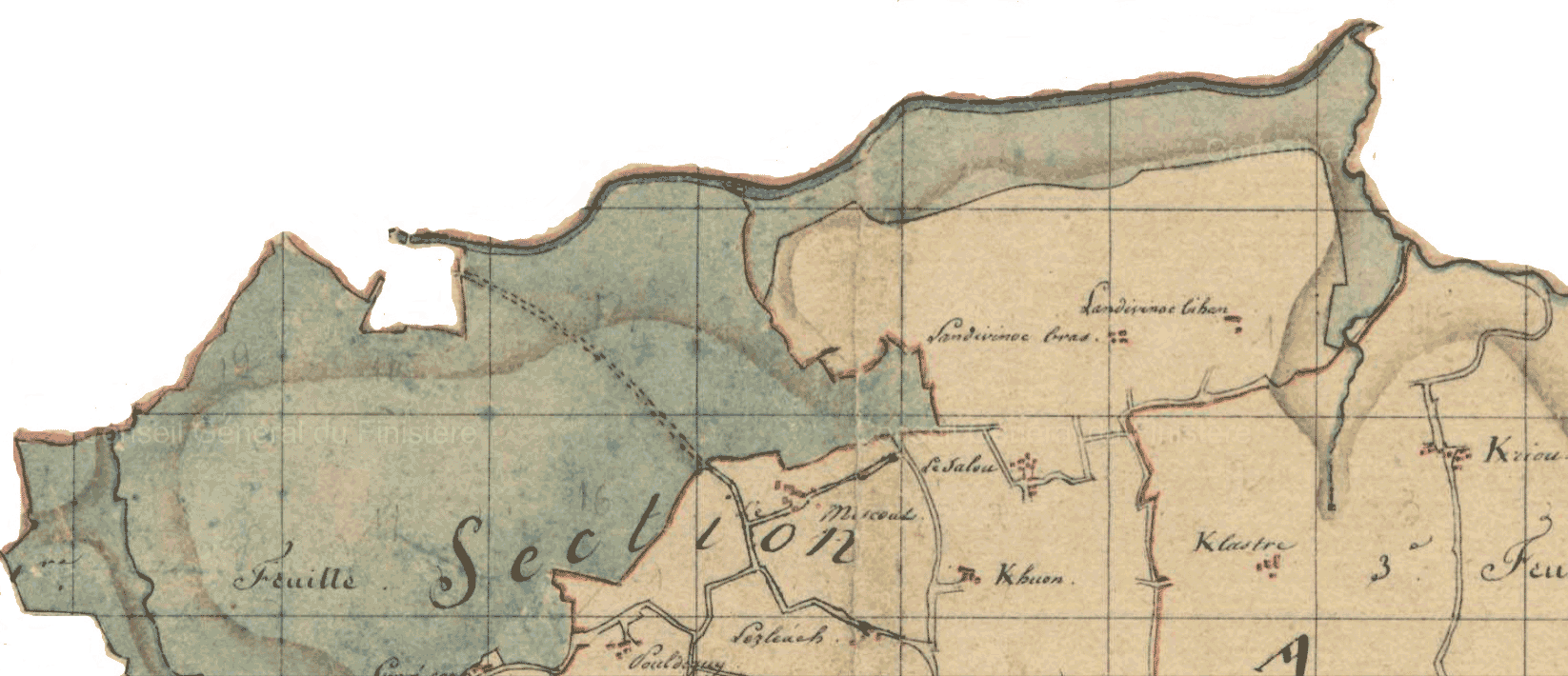 La juxtaposition de la carte IGN actuelle avec les plans du cadastre napoléonien du début du 19è siècle nous permet de situer les endroits où la rivière a été déviée. Il s'agit des plans du nord des communes de Ploudiry et de Loc-Eguiner qui sont délimitées par l'Elorn.