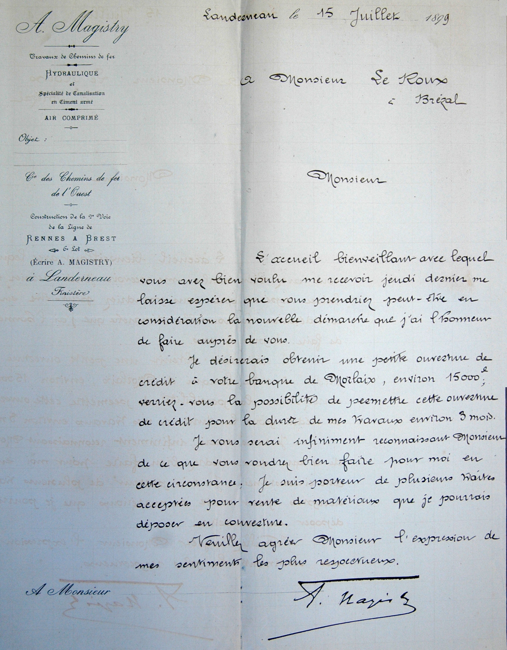 Lettre d'Auguste Magistry à Albert Le Roux de Brezal le 15 juillet 1899 (Fonds Huon de Penanster ADQ 269 J 3). A cette date la 2è voie venait d'être terminée, le crédit demandé par Magistry avait peut-être pour objet des constructions annexes et complémentaires. Quant à la banque en question, Albert Le Roux l'avait cédée à Messieurs Rolland et Cie le 14/7/1882, mais il pouvait, bien sûr, servir d'intermédiaire. | |