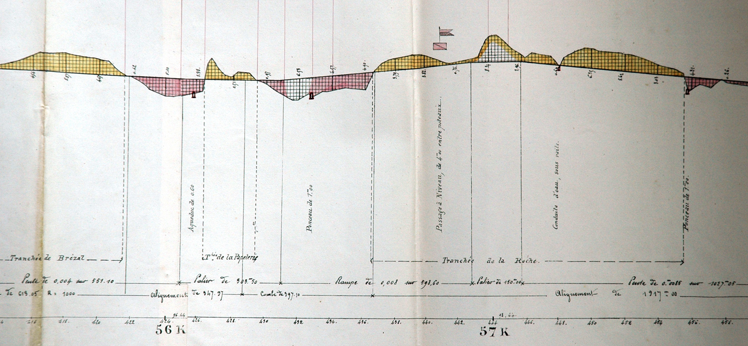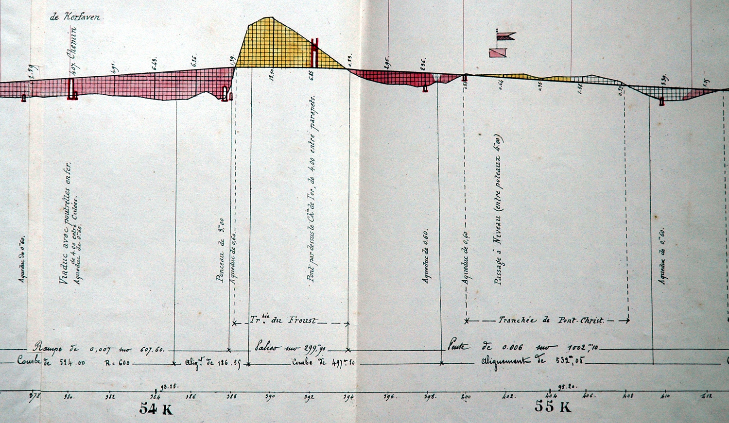 | 1862 | Le 30/6/1862, un schéma du profil en long montre l'avancement des travaux pour l'atelier de La Roche-Maurice (10.253 m.) : pour les sections Kerfaven et du Frout, la plateforme est terminée, quelques élargissements sont à faire à Pont-Christ. | Création de la plateforme |