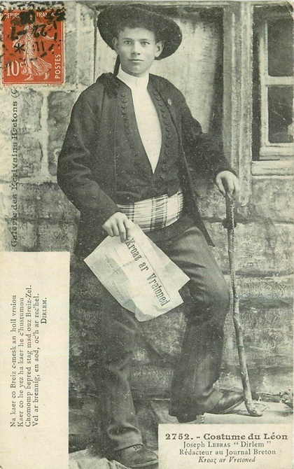 Ci-contre, Joseph-Pierre Le Bras, alias "Yann Brezal", à 17 ans, vêtu de l'habit "justinok" de son frère Alain ; le regard vif et droit ; sur son vêtement on voit l'insigne breton qui avait été créé par les poètes, selon M. Jaffrennou, pour que les patriotes se reconnaissent entre eux ; dans sa main droite le journal Kroaz ar Vretoned et dans sa main gauche un gros bâton, pour se défendre si besoin des ennemis du pays.