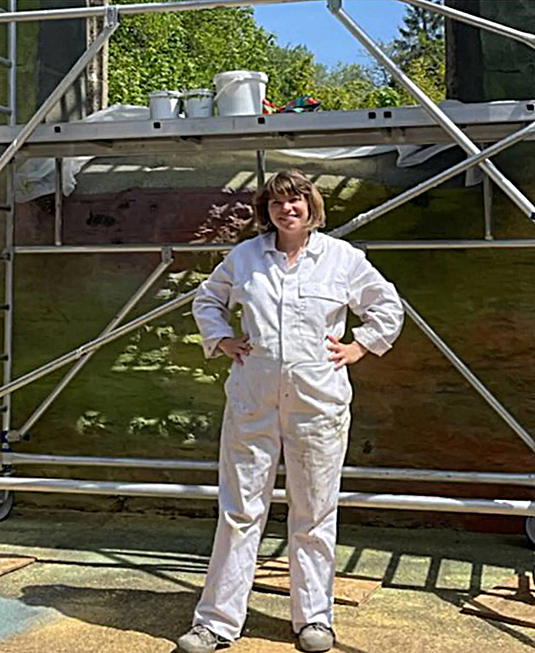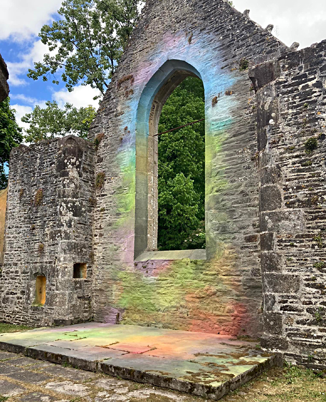 Flora Moscovici a réalisé une peinture qui se déploie à l’échelle de l’église Pont-Christ, archétype par excellence de la ruine romantique. Elle a peint les pierres par zones qui se dévoilent progressivement par tableaux successifs et en privilégiant l’expérience de l’oeuvre. Son intervention propose un dialogue entre couleurs et architecture dans une forme de non-monumentalité. Flora Moscovici s’est intéressée à un ensemble d’éléments constitutifs de la ruine, tels que les fenêtres, les encadrements, les arcades, les niches, la colonne, l’autel, ainsi que des ajouts plus récents, notamment les murs de pierres et de ciment qui bouchent les deux fenêtres situées sur les côtés de l’autel. Les volumes et les surfaces ont été recouverts de pigments à la chaux. Avec légèreté, la peinture a été pulvérisée ou appliquée à la brosse afin de couvrir les surfaces tout en révélant les pierres et en mettant en évidence les différentes textures de celles-ci. Le nuancier que l’artiste a créé pour l’occasion reproduit la gamme colorée de la végétation, des pierres et de la globalité de l’environnement, tel qu’il apparaît au printemps. Une trentaine de nuances se déclinent ainsi en variations de gris brun, gris bleuté, gris jaune, marron écorce, vert herbe, vert pin, vert gazon, vert lichen, lichen jaune, ocre des pierres, herbe sèche, mousse brûlée, rivière, alien, feuille rouge, pelouse, feuille soleil, feuille rouge, fleurette violette, bouton d’or, verdâtre, rosette, gris nuage, ciel brut, ciel doux, ciel vif, ciel gris.