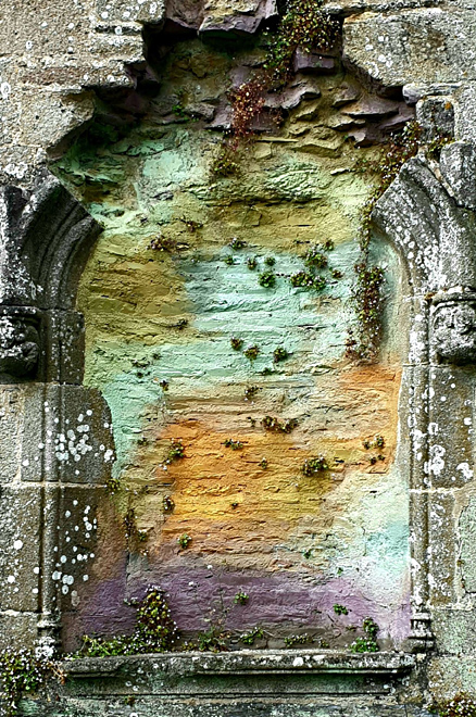 L’association des couleurs varient selon les endroits et les différentes atmosphères qui apparaissent. Le mauve des violettes sauvages envahit le haut de la colonne, avant de se fondre avec le vert de l’herbe. La peinture réalisée sur la fenêtre de l’autel prolonge le bleu du ciel et le vert des arbres. La couleur se diffuse sur les murs et matérialise de la sorte des jeux de lumière, des rayons de couleurs éphémères qui illuminent les pierres. Le pavement de l’autel, complètement scénique, se couvre de déclinaisons de jaune et devient solaire.
