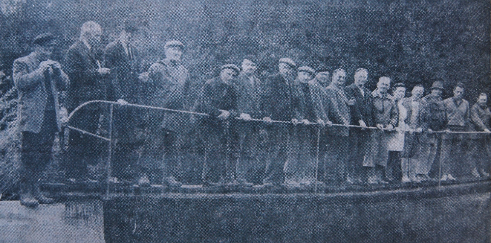 A 16 h., les membres du bureau et les gardes fédéraux se sont retrouvés Au rendez-vous des pêcheurs, chez Mme Jézégou. Non loin de là, la nouvelle passerelle franchit l'Elorn. Elle est l'oeuvre de MM. Hernot et Cassol, de Landerneau, et du garde Lanneval. Deux poteaux de bois déclassés de l'E.D.F., solidement ancrés dans deux socles en béton, en constituent l'armature. Un plancher de bois et un garde-fou en tubes de fer permettent de traverser la rivière en toute sécurité.