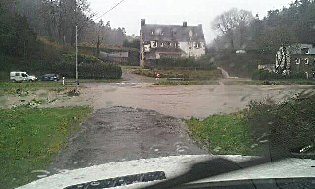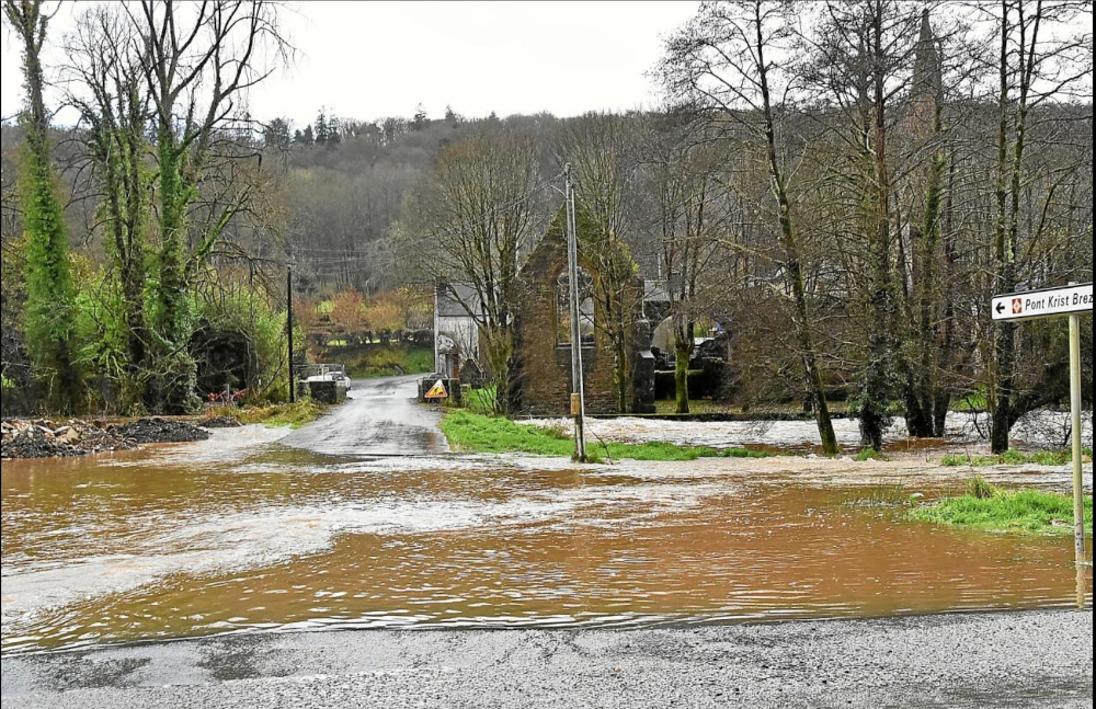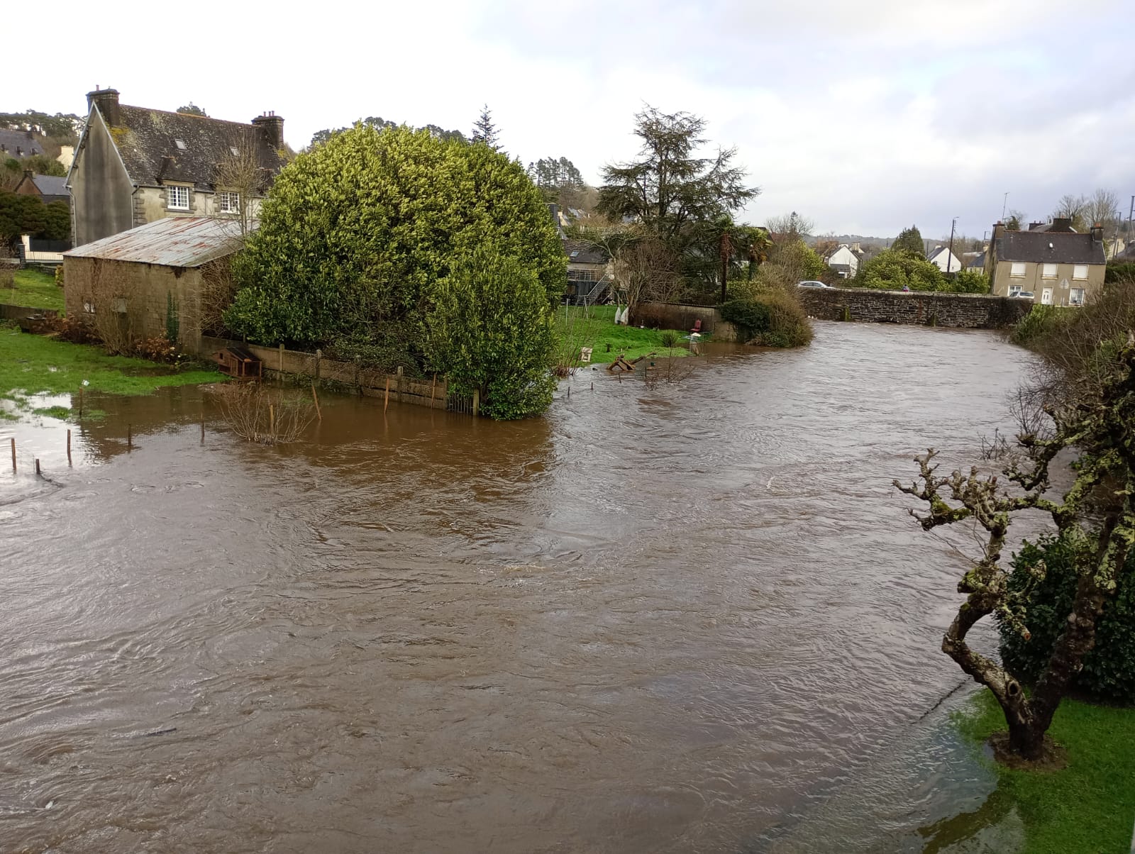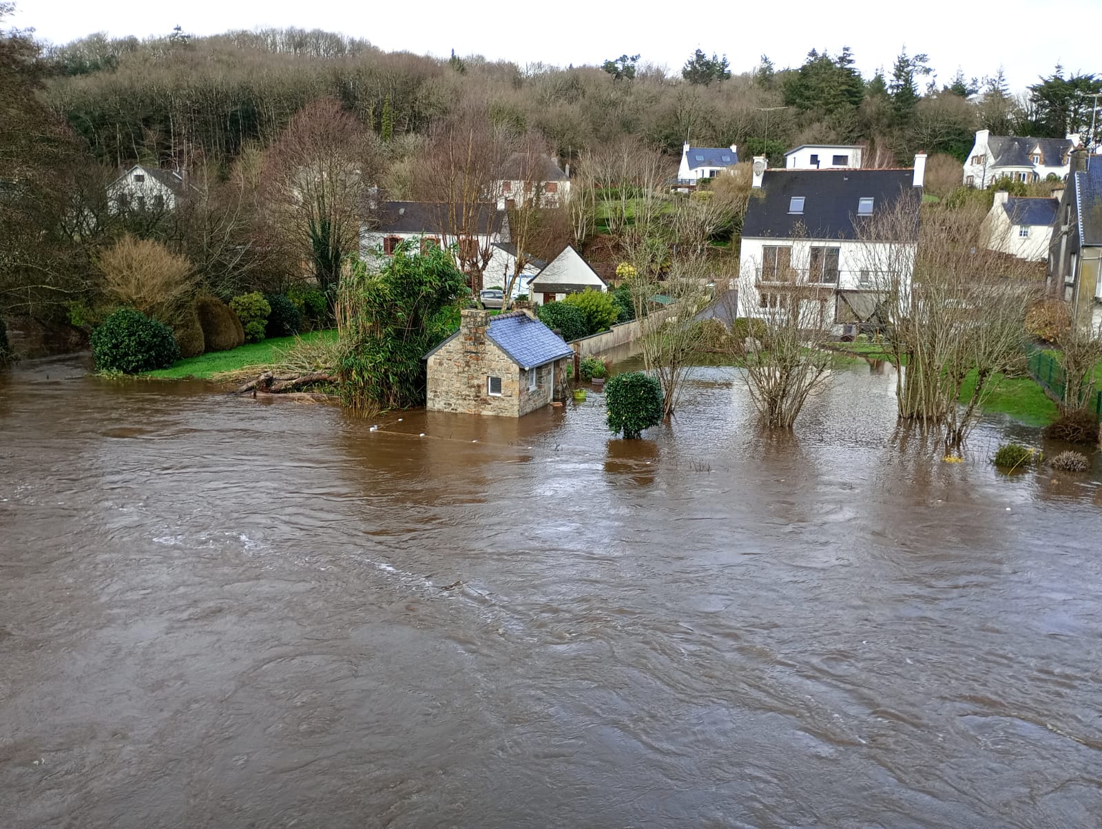 A Pont-Christ : Le pont est recouvert de 0,15 mètre d'eau ainsi que la route longeant la rive droite de l'Élorn (D712) et la chapelle sur la rive gauche baigne dans l'eau.