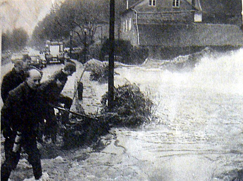 La photo du quotidien, pas très nette, montre bien cependant que la prairie en amont du pont est complètement recouverte. Au fond, on aperçoit la maison Levionnois-Jamard qui fut construite peu de temps auparavant en 1959.