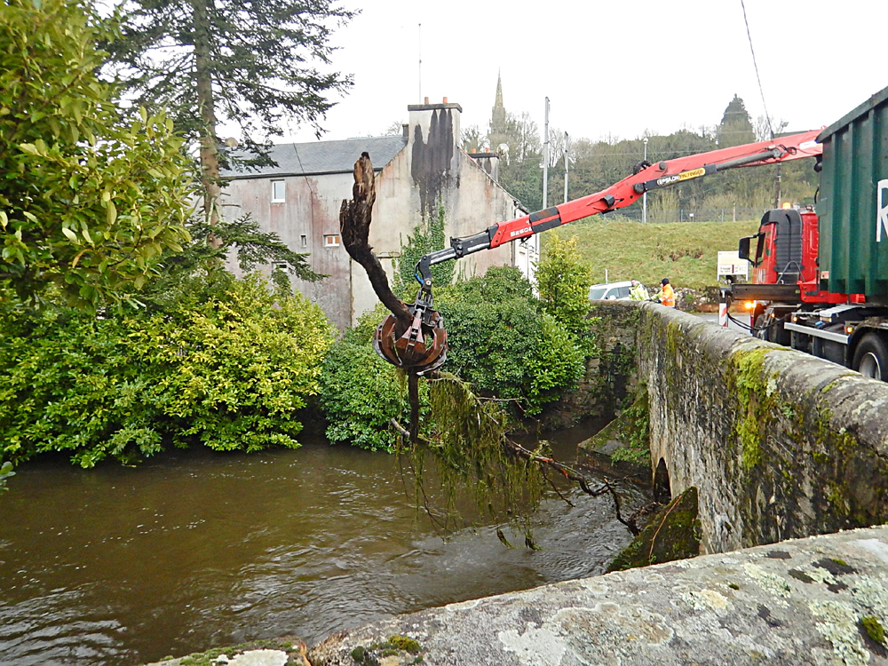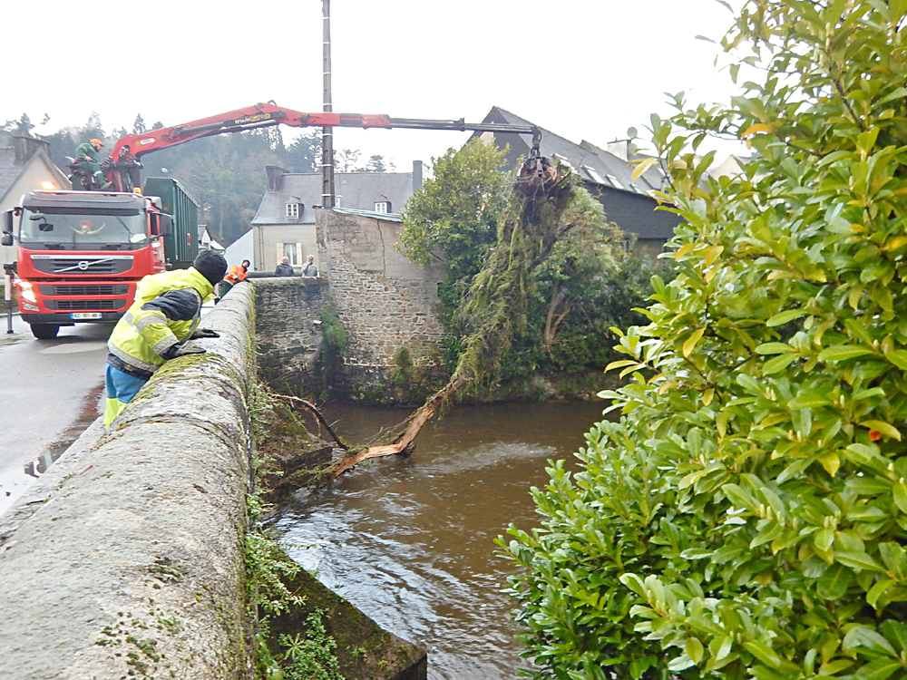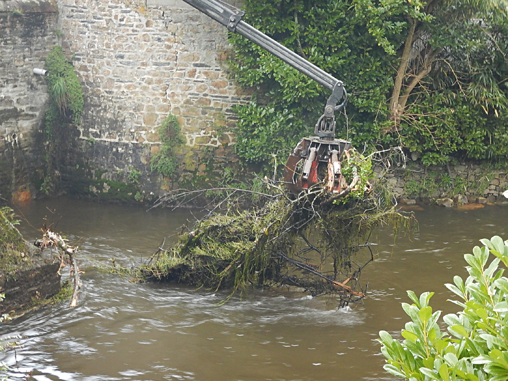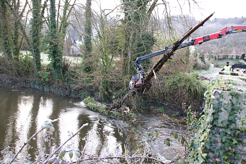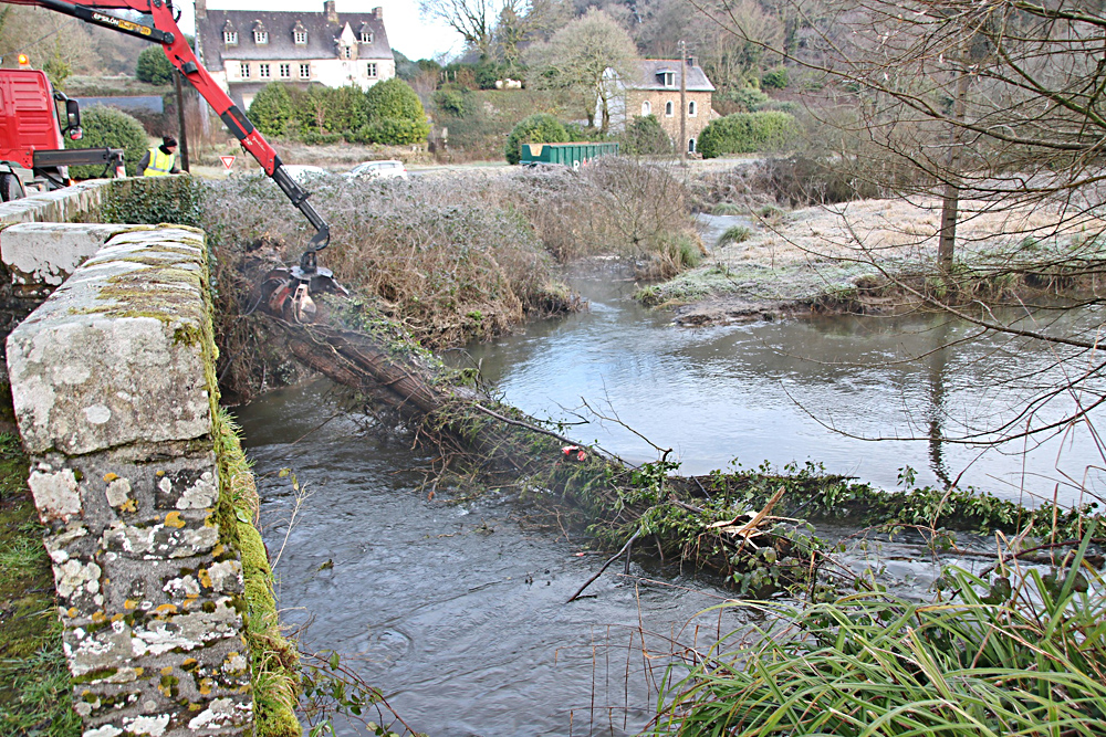 Les arbres de Pont-Christ et de La Roche ont été retirés de l’Elorn par une entreprise spécialisée, en accord avec la Communauté de communes du Pays de Landerneau-Daoulas, qui a délégué la compétence GEMAPI au Syndicat de bassin de l’Elorn, maître d’ouvrage de l’opération.