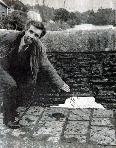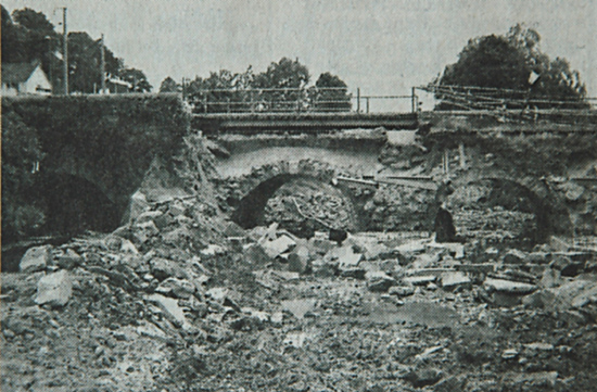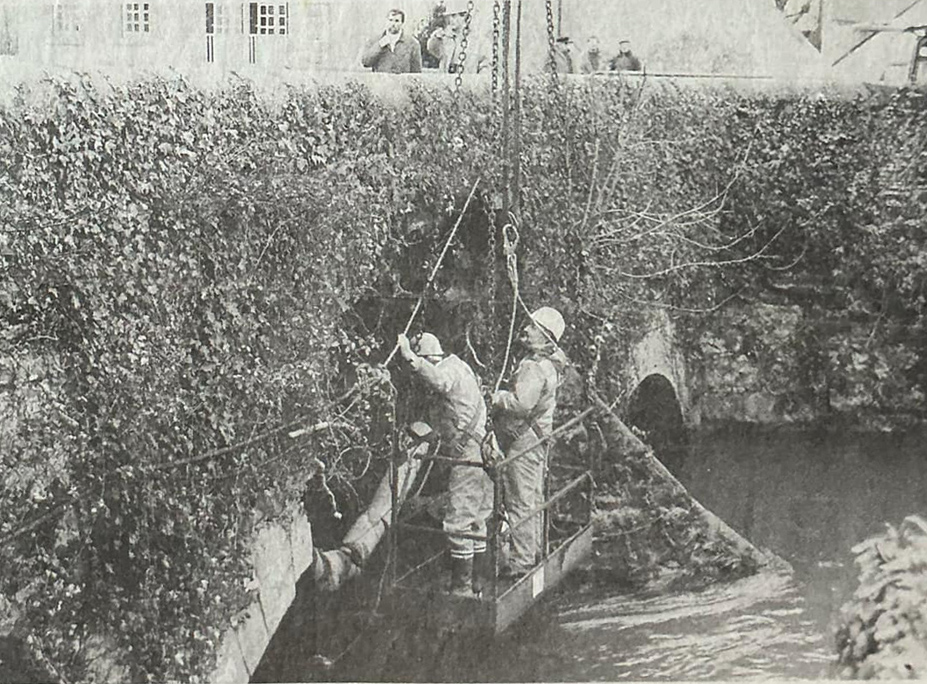 François Marc, le maire de la commune à cette époque, nous montre ici les dégâts et la brèche vue du tablier. Il est évident que dessous c'est pire.