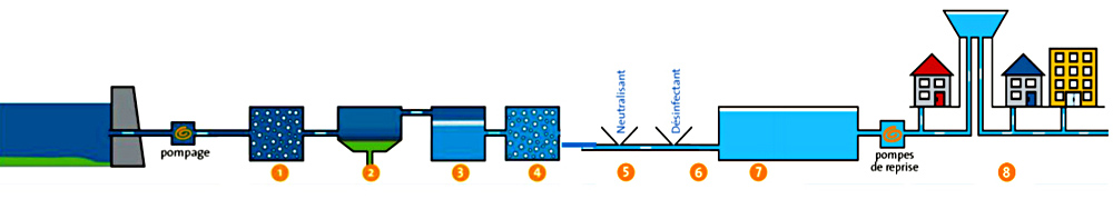 | 1 Préozonation | 2 Décantation | 3 Filtration | 4 Postozonation | 5 Correction de l'agressivité | 6 Désinfection finale | 7 Stockage usine | 8 Distribution et stockage |