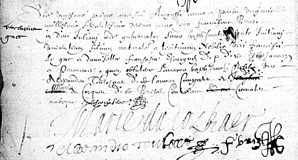 | Vincentius Gac - Die vigesima prima mensis augusti anno a partu virginis millesimo sexcentesimo decimo nono ego Franciscus Briz in divi Juliani ad gubernator fano baptismati.. ..onte initiani Vincentius, filius naturalis et legitimus nobilis viri Francisci Le Gac et damisella Fransesa K/anguen D. et D. de K/lossouarn et Penannech, qui . . . . baptismati nobilis viri Alexandre Toulc'hoat D. de Launay cumpater et Maria du Cozquer D. de Bresal Coatelan cumater amboque subscrip.. Marie du Cozkaer - Alexandre Toulcoet - f. briz | Vincent Gac - Le 21 août de l'année suivant la naissance virginale 1619, moi François Briz à St-Julien . . . . j'ai baptisé . . . Vincent, fils naturel et legitime de noble homme François Le Gac et de damoiselle Françoise K/anguen S. et D. de K/lossouarn et Penannech, qui fut porté sur les fonds baptismaux par noble homme Alexandre Toulc'hoat, S. de Launay, parrain, et par Marie du Cozquer, D. de Bresal Coatelan, marraine, et les deux signent. Marie du Cozkaer - Alexandre Toulcoet - f. briz |