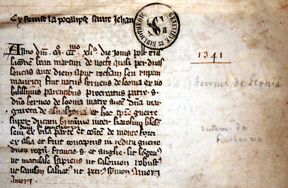 Ce texte, en latin, est une annotation figurant sur la bible des seigneurs de Léon. Vers 1330, Hervé VI de Léon commande à un enlumineur parisien une Bible historiale, c’est-à-dire un ensemble de récits et textes bibliques, richement illustrés. Nous savons que cette Bible, conservée aujourd’hui à la Bibliothèque Saint-Geneviève (ms 22), se trouvait à la Roche-Maurice en l’an 1341, à cause de cette fameuse annotation manuscrite qui se trouve sur le feuillet 451.