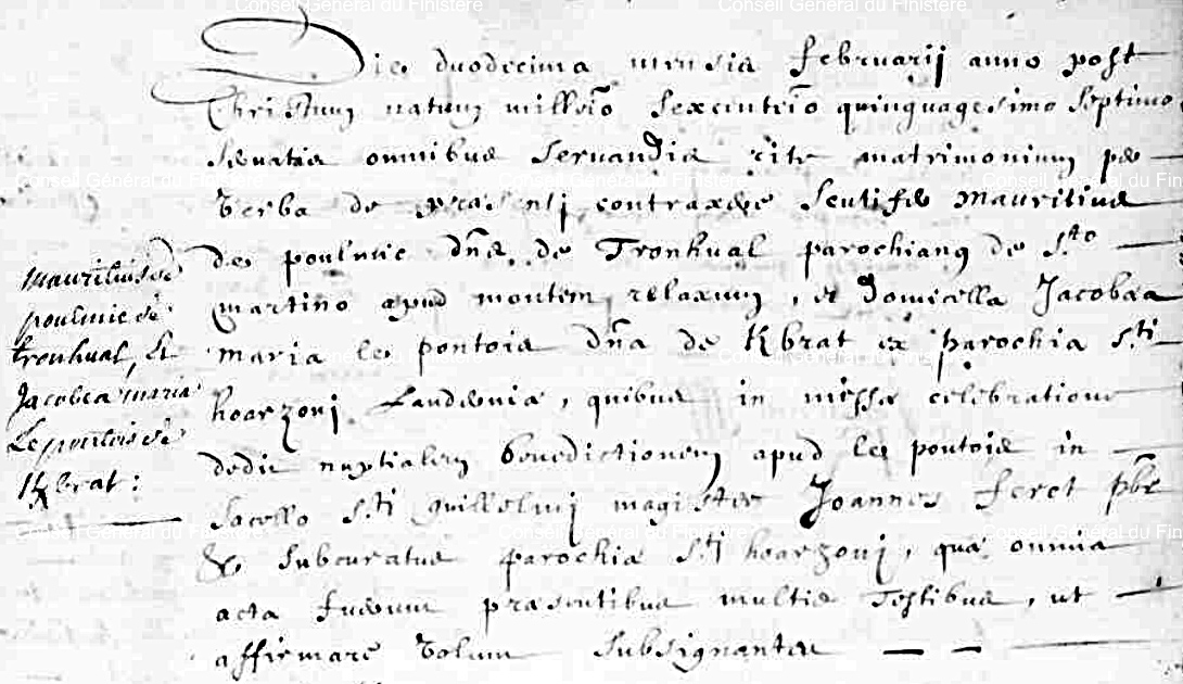 | Mauritius de Poulmic de Tronhual et Jacobea Maria Le Pontois de K/brat : Die duodecima mensis februarii anno post Christum natum millesimo sexcentesimo quinguagesimo septimo, servatis omnibus servandis rite, matrimonium per verba de praesenti contraxere scutifer Mauritius de Poulmic dominus de Tronhual, parochianus de Sancto Martino apud Montem Relaxum, et domicella Jacobea Maria Le Pontois, domina de K/brat ex parochia Sancti Hoarzoni Landernia, quibus in missa celebratione dedi nuptialem benedictionem apud Le Pontois in sacello Sancti Guillermi magister Joannes Ferret pbr et subcuratus parochia Sancti Hoarzoni, qua omnia acta fuerunt praesentibus multis testibus ut affirmare volum subsignantes. | Maurice de Poulmic de Traonhuel et Jacquette Marie Le Pontois de K/brat : Le 12è du mois de février de l'année 1657 après la naissance du Christ, en observant toutes les règles et le rite, contractèrent mariage par paroles de présents écuyer Maurice de Poulmic, sieur de Traonhuel, paroissien de Saint-Martin près de Morlaix, et damoiselle Jacquette Marie Le Pontois de la paroisse de Saint Houardon à Landerneau, à qui lors de la célébration de la messe Maître Jean Feret prêtre donna la bénédiction nuptiale dans le petit sanctuaire de St Guillaume près du Pontois, auquel acte furent présents de multiples témoins soussignants pour affirmer cette volonté. |