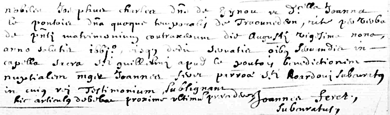 | Nobilis Josephus Charles, dominus de K/ynou, et domecilla Joanna Le Pontois, domina quoque temporalis de Traoun-Edern, rite per verba de praesenti matrimonium contraxerunt die augusti vigesima nona, anno salutis 1661°, eisque dedit servatis omnibus servandis in capella sacra Sancti Guillermi apud Le Pontois benedictionem nuptialem magister Joannes Feret, parrochia Sancti Hoarzoni, subcuratus, in cuius rei testimonium subsignant . . . . . Joannes Feret, subcuratus. | Noble Joseph Charles, sieur de K/ynou, et damoiselle Jeanne Le Pontois, dame aussi propriétaire temporelle de Traoñ-Edern, contractèrent mariage selon le rite et par paroles de présents, le 29 août de l'année de salut 1661, et la bénédiction nuptiale leur fut donnée en observant toutes les règles dans la chapelle sacrée de Saint-Guillaume près du Pontois par maître Jean Feret, sous-curé de la paroisse de Saint Houardon, en cette circonstance les témoins signent . . . . Jean Feret, sous-curé. |