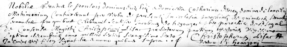 | Nobilis Renatus Le Pontois, dominus dicti loci, et domicella Catharina Derien, domina de Lana... matrimonium contaxerunt per verba de praesenti in ecclesia parochiali de Quimerch servatis servandis pro quibus celebravit scutifer Jacobus de Hegouzer pbr parochia de St Segal de consensu magistri Christophori Lisac praedictarum partium rectoris vigisima septimo decembris anno millesimo sexcentesimo sexagesimo sexto in cuius rei fidem signat die et anno quibus supra. Christophorus Lisac, rector Sancti Hoarzoni. | Noble René Le Pontois, sieur dudit lieu, et damoiselle Catherine Derien, dame de Lana..., contractèrent mariage par paroles de présents dans l'église paroissiale de Quimerc'h, en observant toutes les règles, pour lesquels écuyer Jacques de Hegouzer, prêtre de la paroisse de St Segal, avec l'accord de Maître Christophe Lisac recteur des parties précitées, fit la célébration le 27 décembre 1666, en cette circonstance et en foi de quoi, les jour et an que dessus, signe Christophe Lisac, recteur de Saint Houardon. |