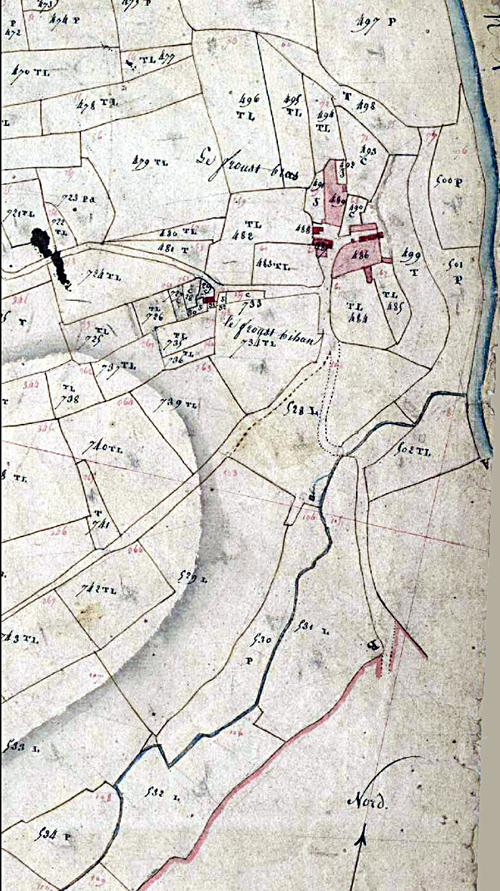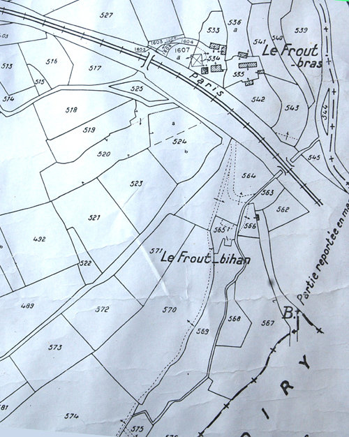 Deux plans : cadastre napoléonien de 1811 et celui de 1950 environ. Attention : Le Frout Bihan désignait, autrefois, une petite ferme qui a disparu, mais qui aurait été, si elle avait perduré, en face du pont de chemin de fer que l'on connaît aujourd'hui (à la pointe de la parcelle 519 du nouveau cadastre). La ferme n'existant plus, les géomètres du nouveau cadastre ont affecté son nom aux constructions d'un des moulins du Frout, que j'ai toujours entendu appelé "Milin a' Frout" et jamais le "Frout Bihan". Donc, pour la suite, nous garderons les appellations d'origine.