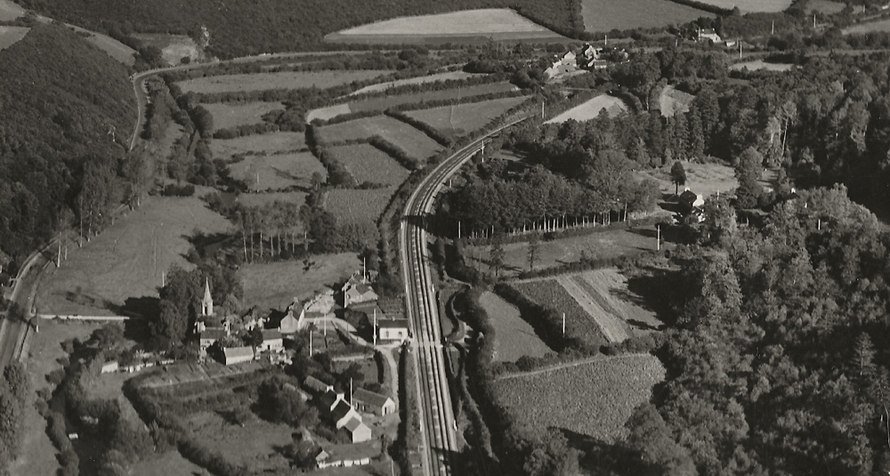 Vers 1950 : le bourg de Pont-Christ à gauche, Gorrequer à droite, Le Frout au fond