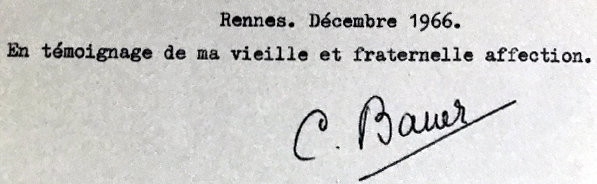 ![]() Mme Bauer, née Claire Martel (1899-1985), était veuve en premières noces d'Albert Tanguy, contrôleur des contributions directes et fils du docteur Albert Tanguy de Landerneau. Claire et Henri Le Bos, dédicataire du poème, étaient cousins issus de germains ayant pour aïeul commun leur arrière-grand-père Louis Despinoy, industriel-brasseur à Landerneau. Claire passait fréquemment ses vacances à Pont-Christ chez ses cousins Le Bos et avait une affection toute particulière pour Henri, qui héritera plus tard du domaine de Gorrequer. Claire Martel était une femme très joyeuse. Elle adorait Pont-Christ et cela se voit très bien dans ses "stances", qui sont magnifiques et rappelleront bien des souvenirs à plus d'un. Merci Xavier. | |