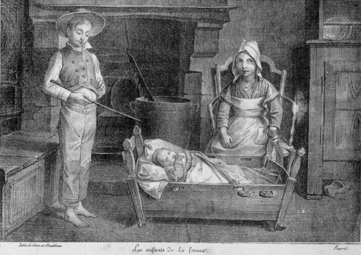 Près de l'escabeau dormait un enfant couché dans un berceau de chêne, élevé à peine de deux pieds. Ainsi, à côté l'un de l'autre, s'offraient les deux anneaux extrêmes de la chaîne de la vie.