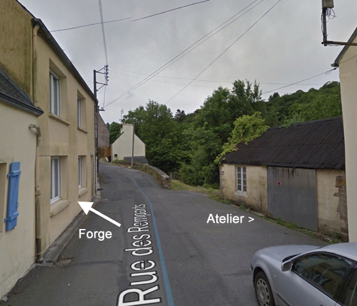Louis Berthou s'est installé en 1945, rue des remparts, près de l'ancien restaurant. La forge en montant à gauche et l'atelier à droite. Il habitait une maison à droite, le petit chemin et les escaliers existent toujours pour aller au ruisseau (source sa nièce).