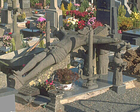 Jean Mazé, marbrier, créateur de cheminées, tailleur de pierres... Il a exercé son activité, rue de l'Elorn, jusqu'en 1980 ? environ. Je ne sais pas précisément. Jean Mazé était ce que l'on pourrait appeler un « artiste » tant son talent de sculpteur de pierres pouvait impressionner. Il a notamment réalisé après le décès de son épouse une sculpture en pierre, « grandeur d'homme », un Christ en croix qu'il a disposé sur la tombe. Une oeuvre d'art et aussi une curiosité du cimetière de La Roche ! « On disait » qu'il avait réalisé quelques sculptures pour l'abbaye de Landévennec avant que les moines de Kerbénéat partent pour Landévennec. Je ne sais pas si c'est vrai. DP